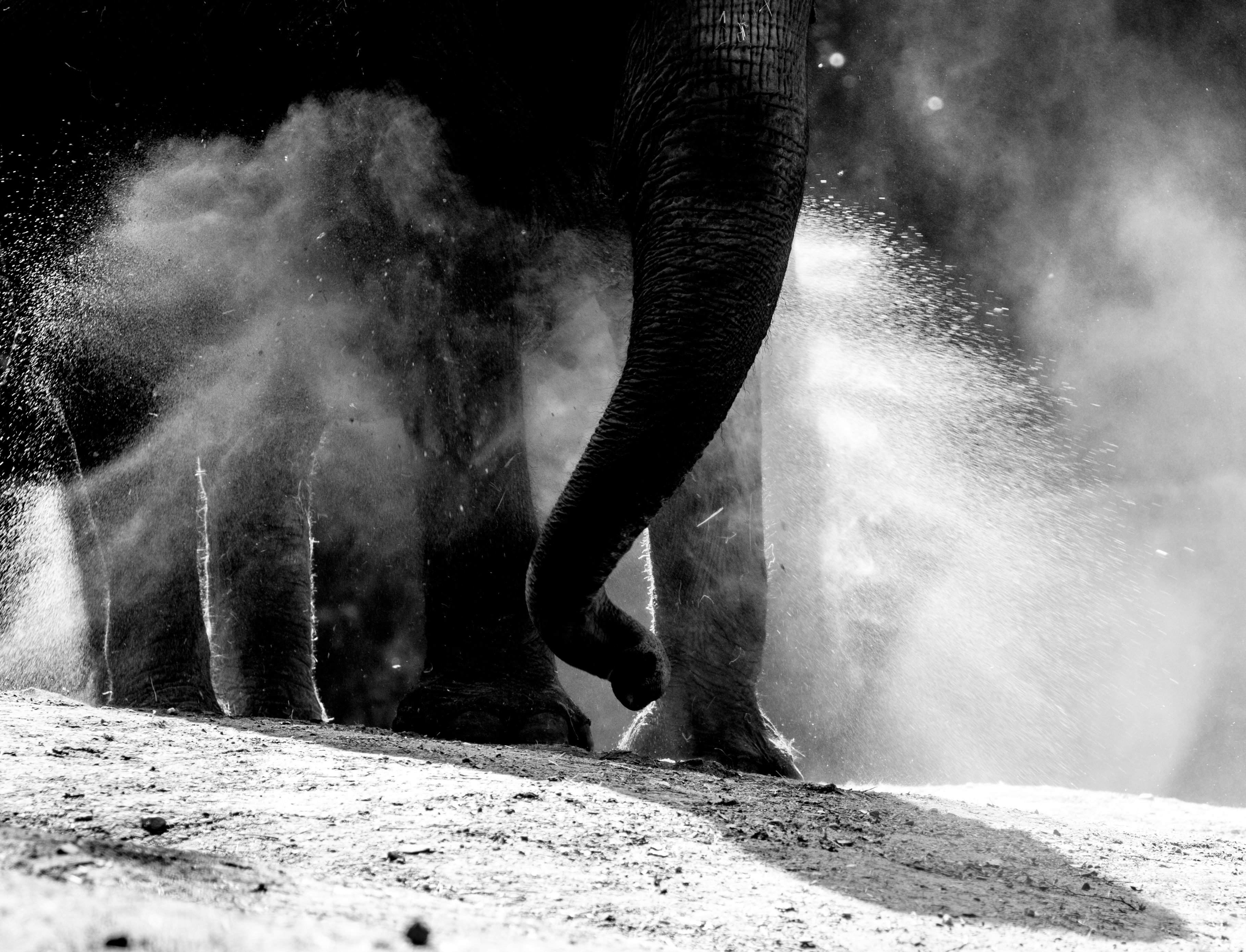 Shot van een zichzelf met zand bespuitende volwassen olifant. Dit was een "lucky shot" en de actie wordt benadrukt door omzetting naar zwart-wit en sterke contrasten.