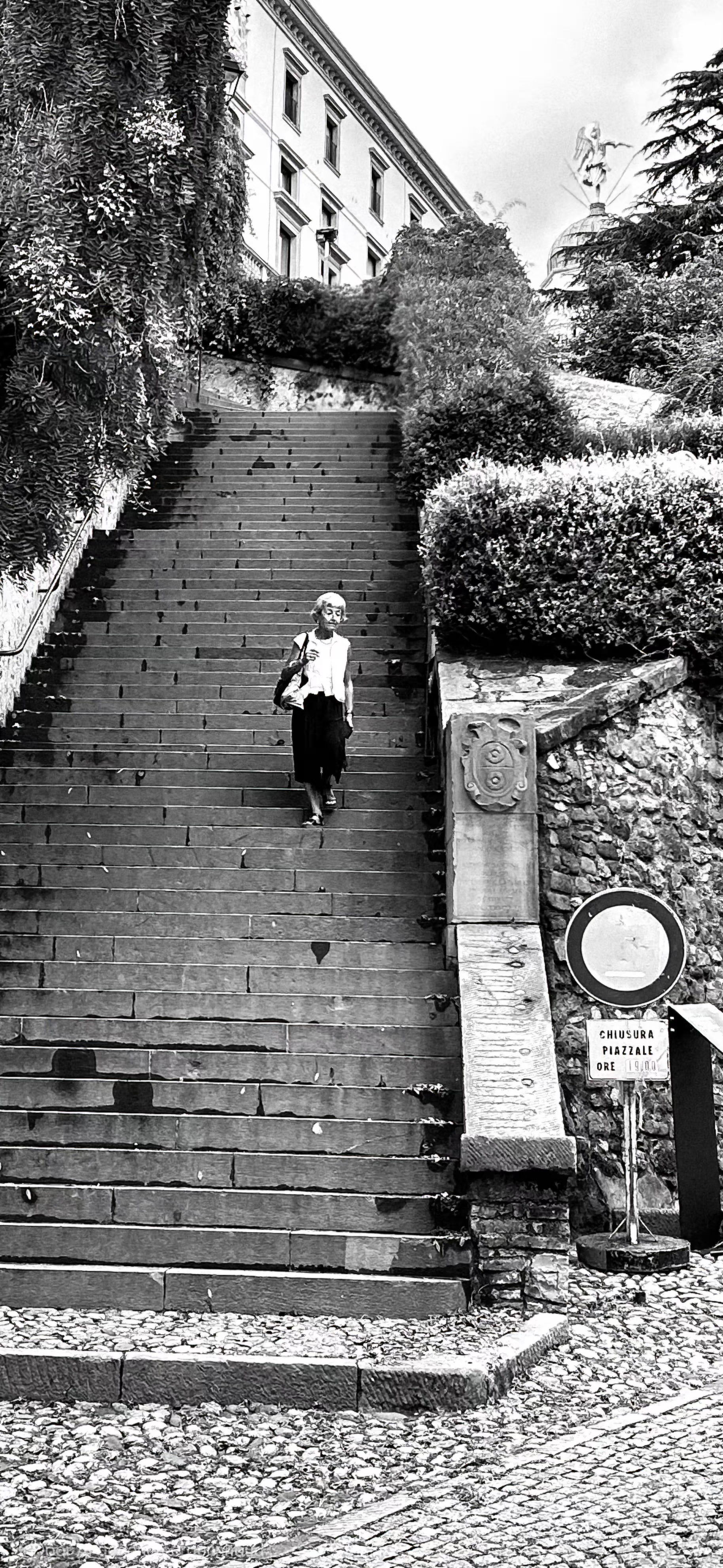 In de prachtige plaats Udine in Noord-Italie kwam deze dame naar beneden lopen. Deze trappen vormen de klassieke route vanaf het historische centrum naar de kasteelheuvel (“colle del castello”).