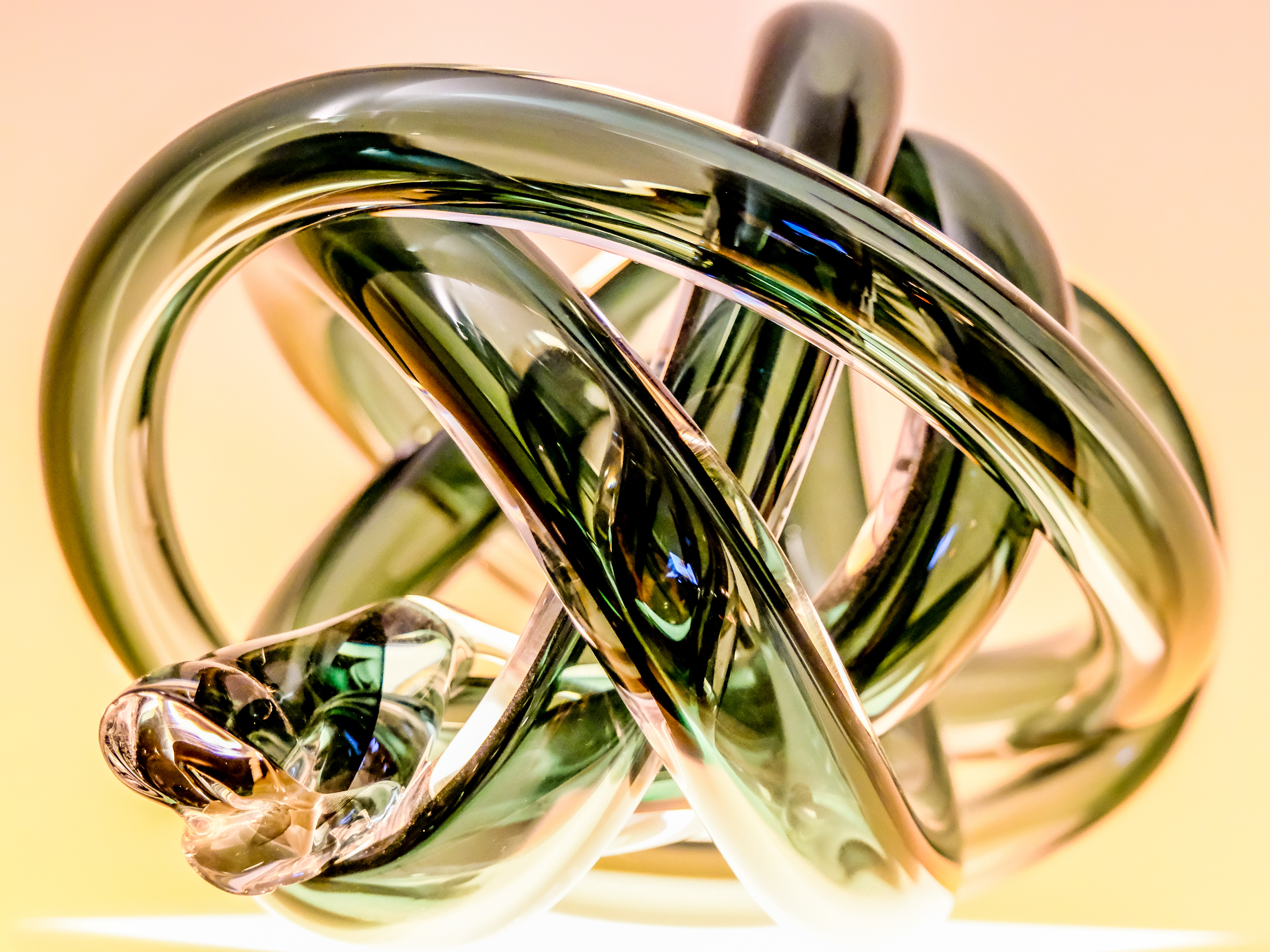Een loodglazen kunstwerk uit Tsjechie gemaakt door glasblazers. Ieder exemplaar is daarmee uniek. Het ligt op een lamp die zorgt voor de warme belichting.