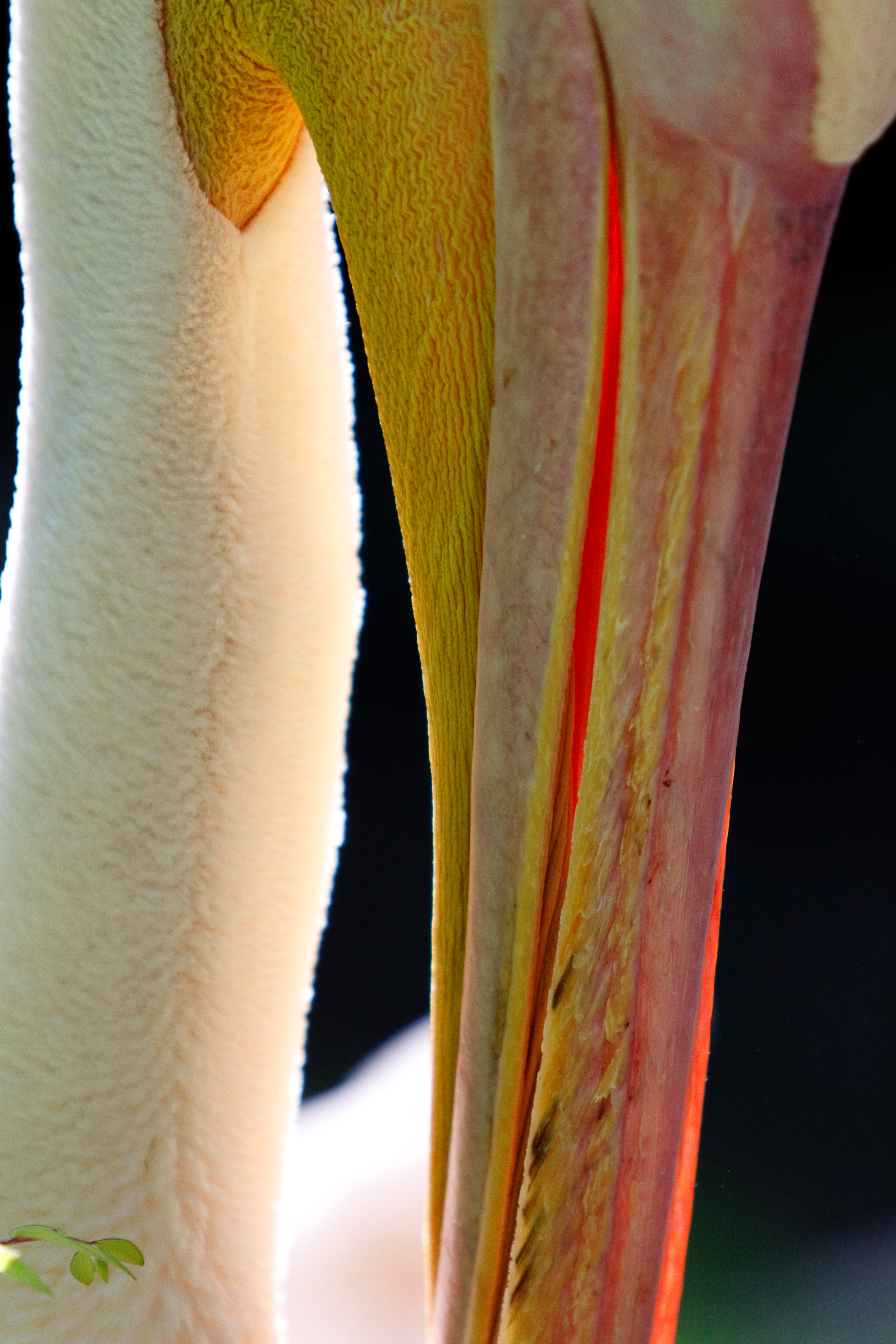 Een uitsnede van een pelikaan in de volle zon. Door de scherpte-diepte in combinatie met het tegenlicht lijkt het alsof deze buitenfoto in een zwarte kamer is gemaakt.