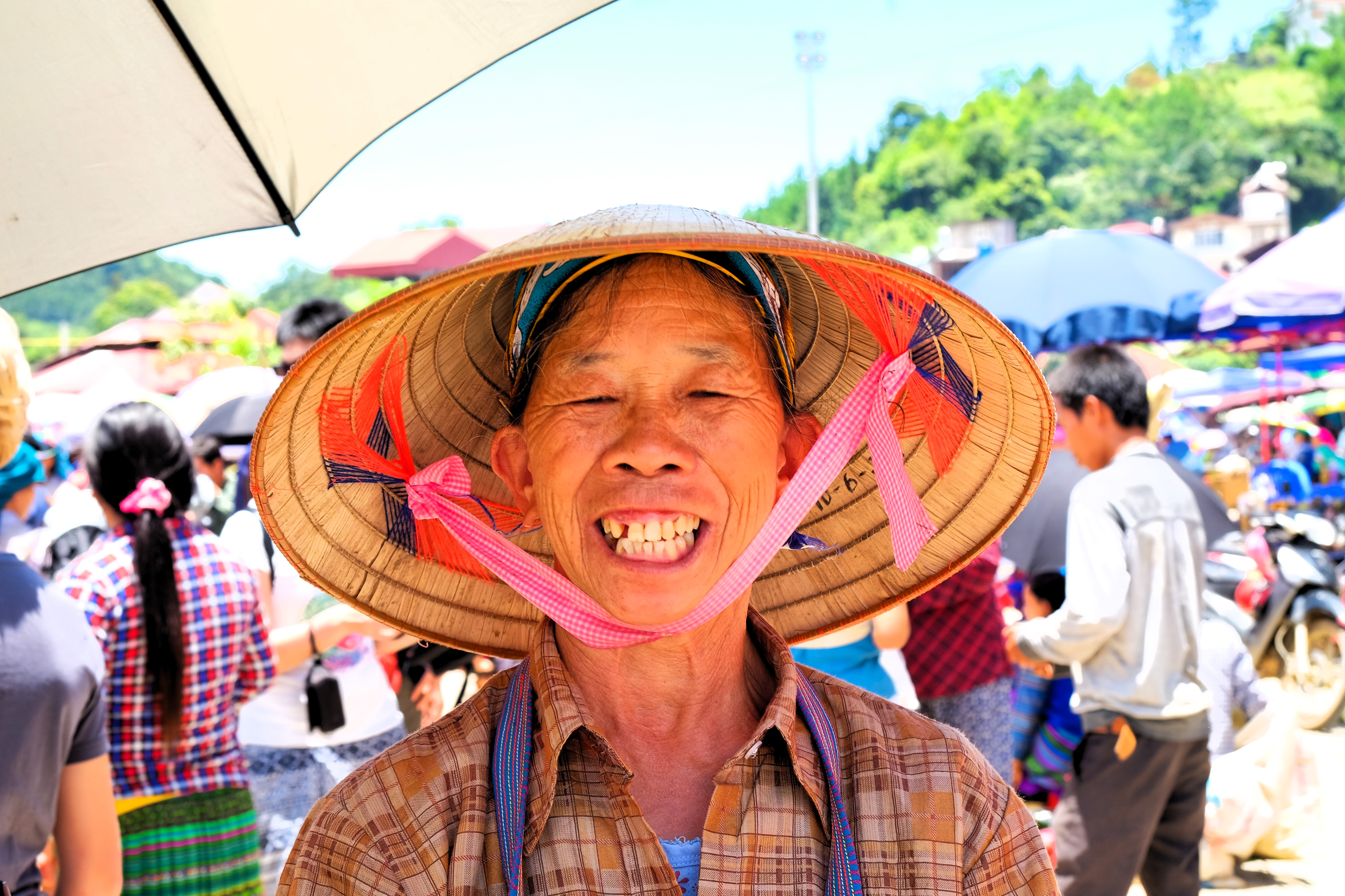 Portret van een vrouw op een markt in Noord-Vietnam. Ze draagt de traditionele ronde hoed, genaamd "nón lá". Maakt deel uit van serie "portretten" gemaakt in Vietnam.