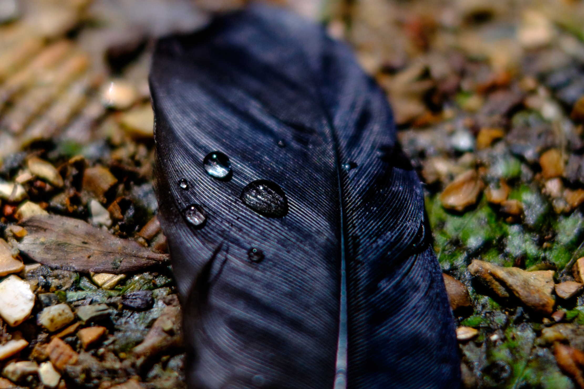 Een veer met een waterdruppel op een grindpad, symboliseert vergankelijkheid in de natuur.