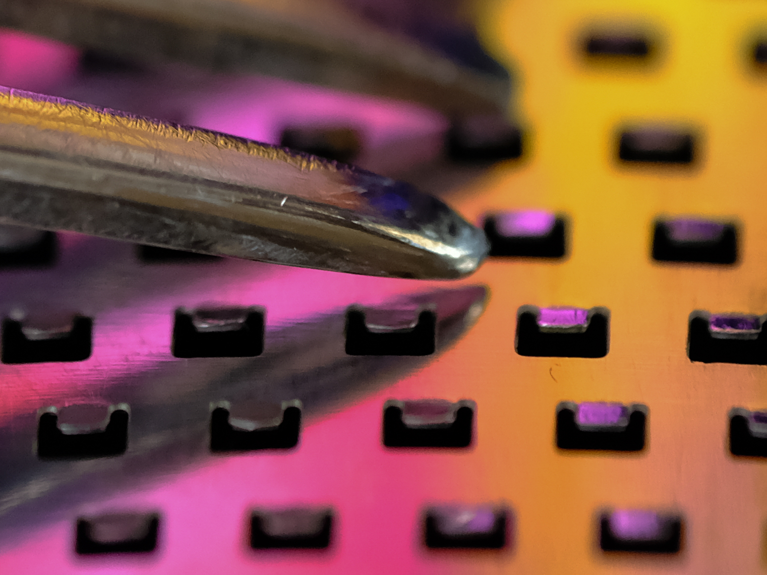 Vork die op een keukenrasp ligt. De kleuren komen van een laptopscherm dat er achter staat. Als je inzoomt zie je mooi de slijtage aan de vork die met het blote oog nauwelijks zichtbaar is.