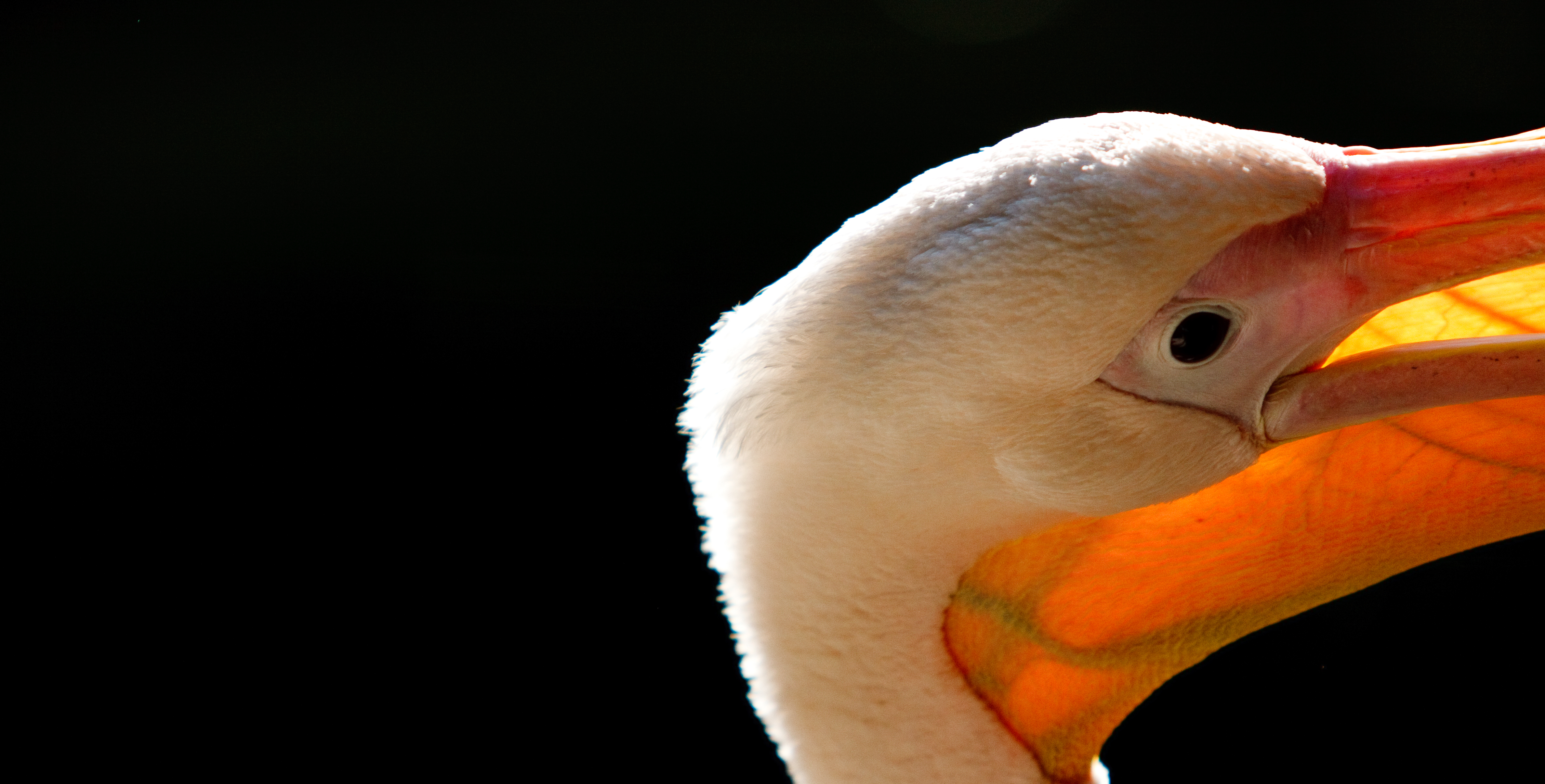 Een uitsnede van een pelikaan in de volle zon. Door de scherpte-diepte in combinatie met het tegenlicht lijkt het alsof deze buitenfoto in een zwarte kamer is gemaakt.
