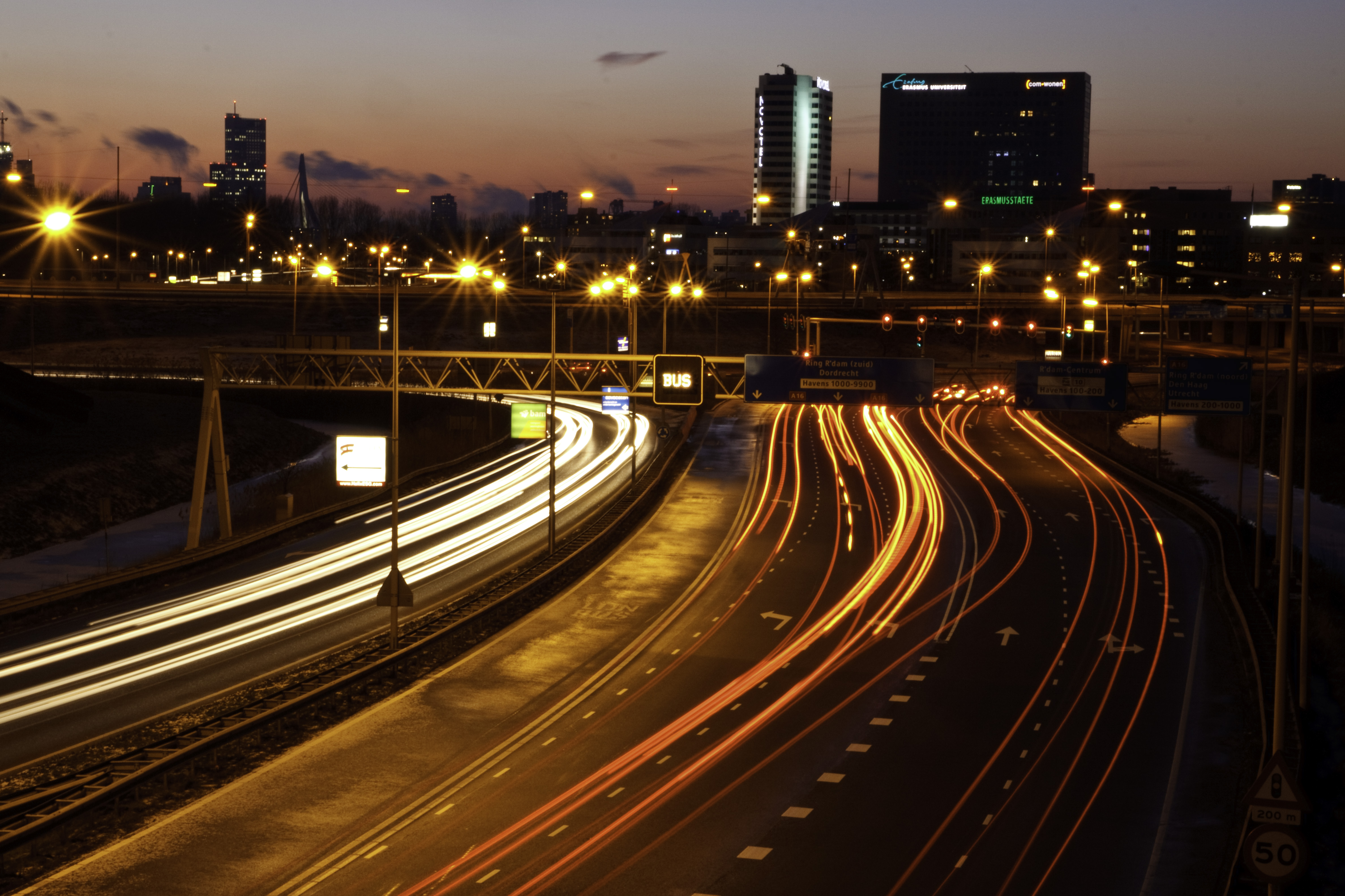 Zicht op Rotterdam - in de late avond vanaf statief met lange sluitertijd wordt een beeld van beweging getoond, waarbij alleen de lichten van het voorbij rijdende verkeer zijn overgebleven